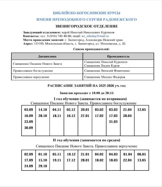 16 мая состоялся очередной выпуск в Звенигородском отделении Библейско-богословских курсов имени преподобного Сергия Радонежского. Заведующий курсами, священник Николай Куренков совершил в крестильном Предтеченском храме благодарственный молебен, обратился к выпускникам с напутственным словом и вручил им свидетельства об окончании курсов.
